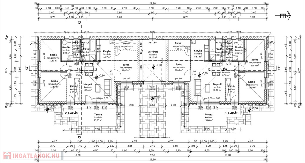 A ház nappali-konyha-étkező 15 nm-es teraszkapcsolattal, 3 külön nyíló szoba, gardrób, külön helyiségben lévő fürdőszoba, wc, mosókonyha elrendezésű.