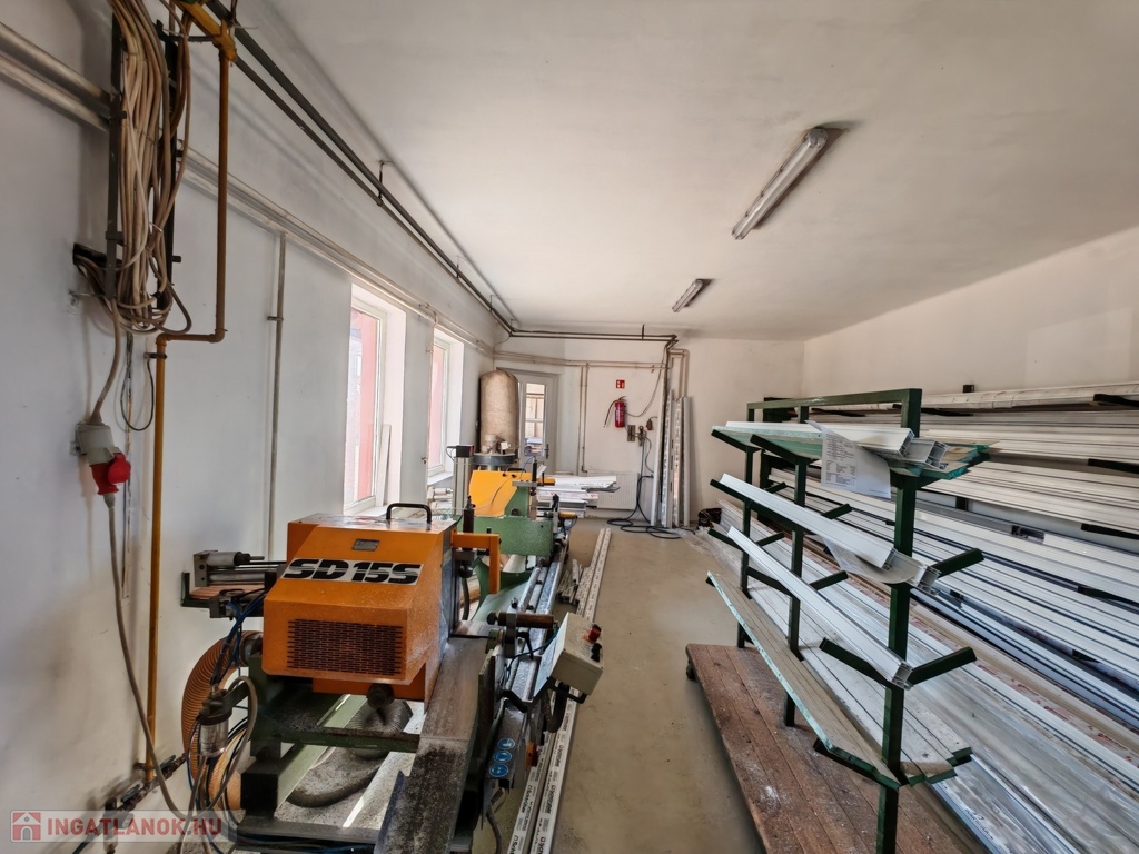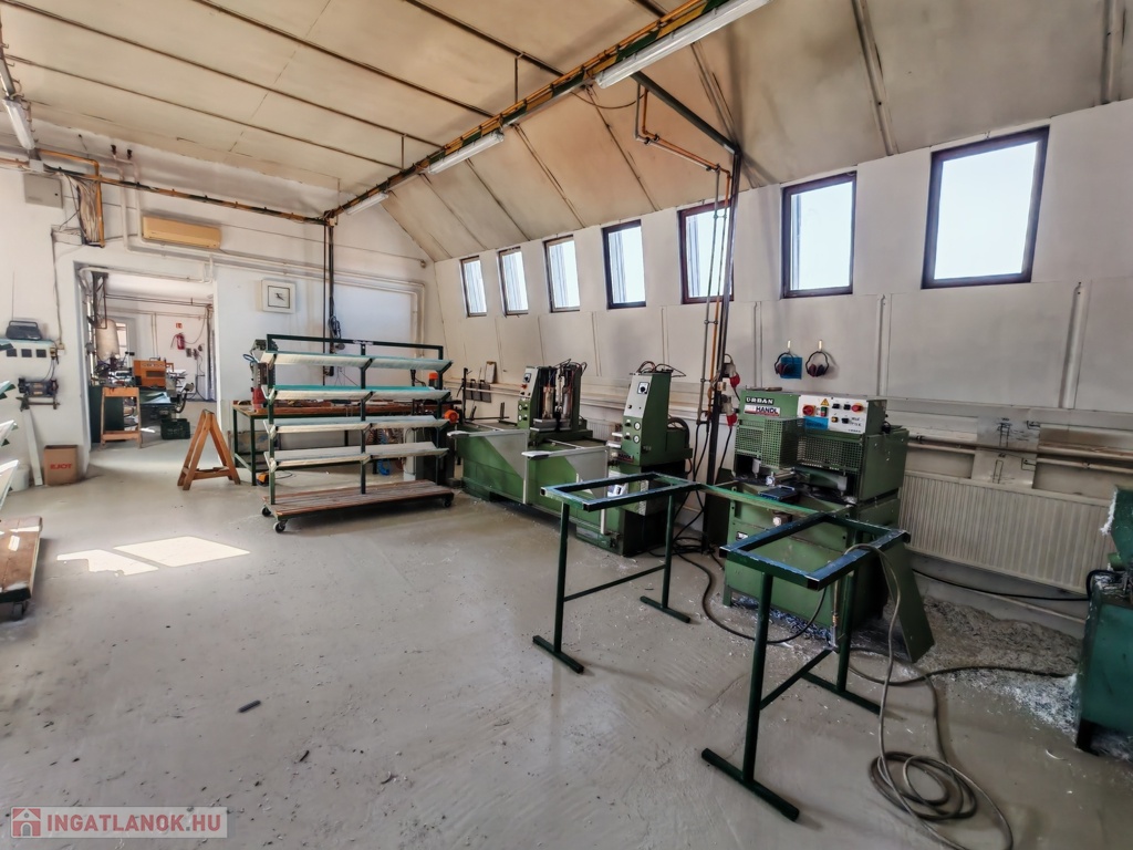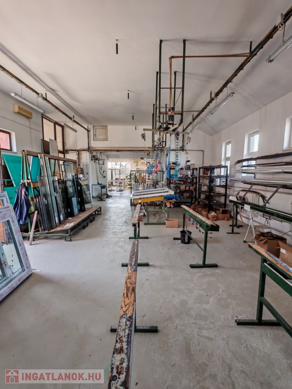 547 nm-es, a 4 részből álló műhely most jelenleg egybe van nyitva, de akár külön-külön is lezárható, tágas készáru raktárral, mosdóval, kazánházzal, ipari árammal (380W-os 3x63 Amper), kompresszor házzal, vegyes tüzelésű kazánnal, de akár gáz-cirkós fűtésrendszer is kialakítható. Találunk továbbá egy 47 nm-es raktárat, amely az új áru tárolására lett kialakítva. A műanyag nyílászáró üzem teljes összeszerelő gépekkel, komplett berendezéssel együtt is eladó, ami +15M Ft.